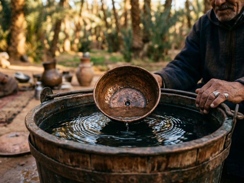 - The Knot Record: To keep track of the turns, the Amine uses a palm fiber rope. Every time the bowl sinks, he ties a knot. This physical “ledger” ensures that there is no dispute about how much water has been delivered to each family.